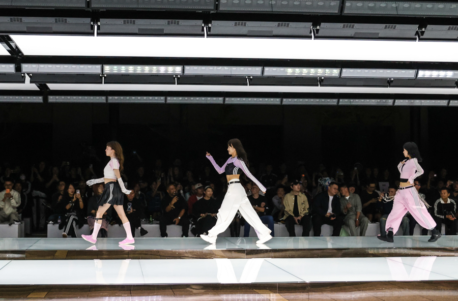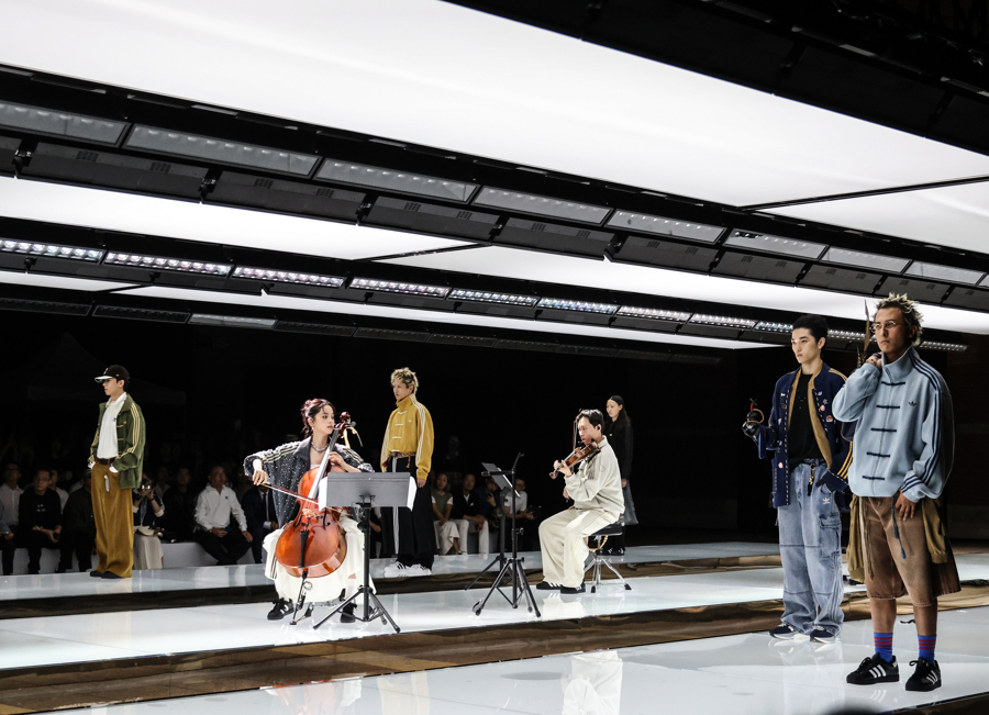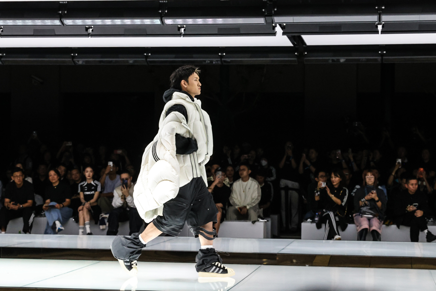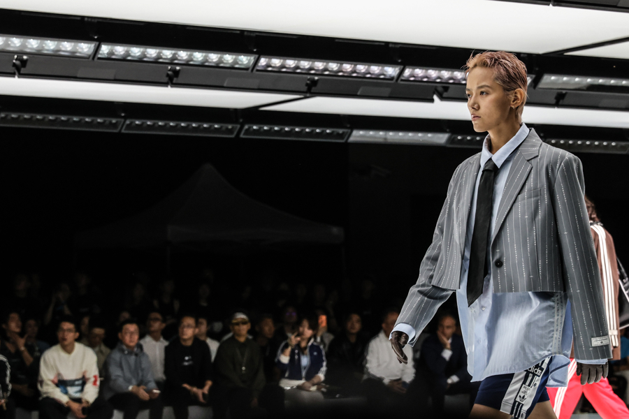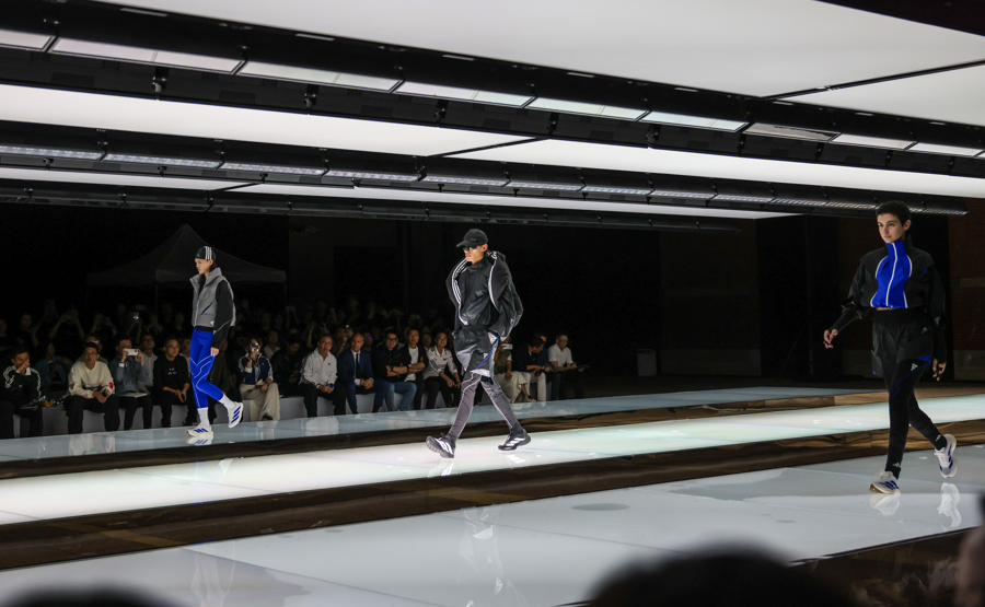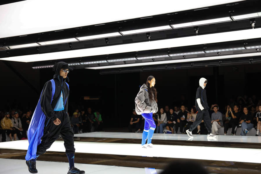 秀场T台是由三条白色发光平台组合成的阿迪达斯经典条纹,观众沉浸在先锋速度、东方之音、街头能量与跨界艺术交织的氛围之中,感受从复古经典运动场到现代街头的时尚旅程。