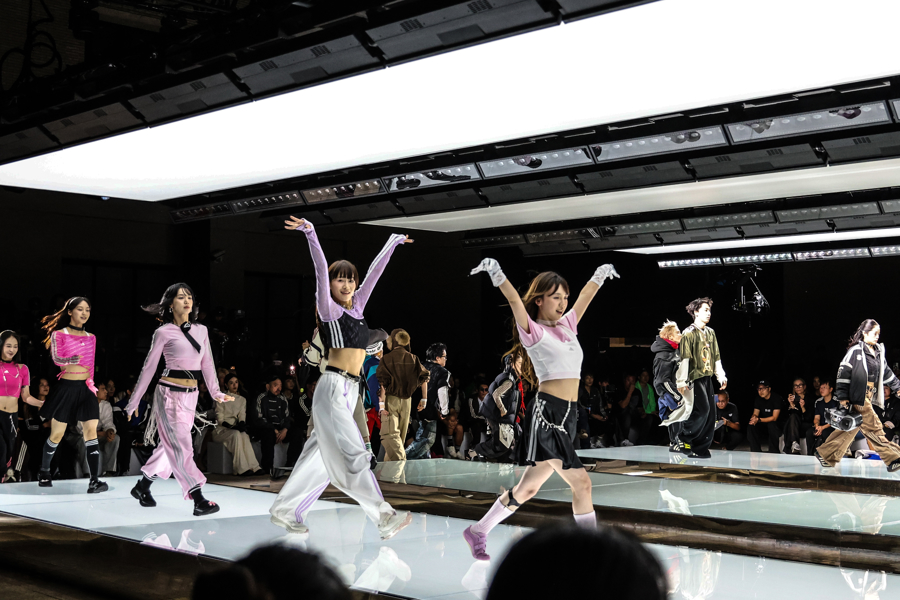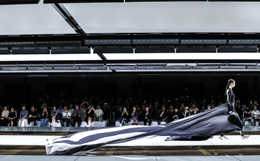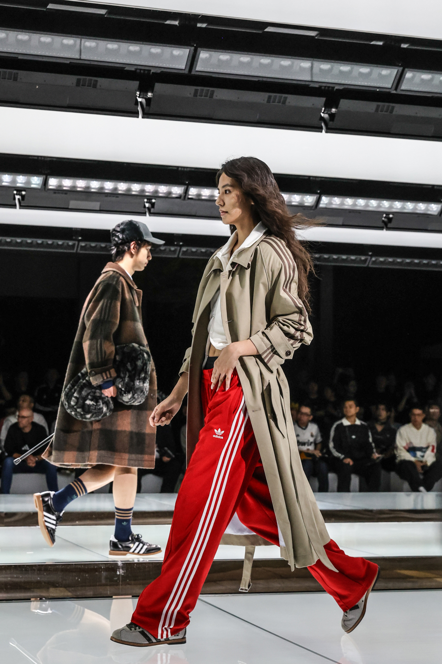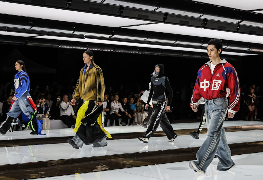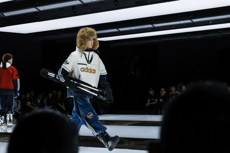 秀场T台是由三条白色发光平台组合成的阿迪达斯经典条纹,观众沉浸在先锋速度、东方之音、街头能量与跨界艺术交织的氛围之中,感受从复古经典运动场到现代街头的时尚旅程。